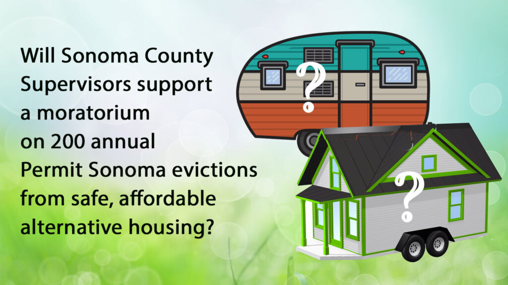 Among the other members of the public supporting a moratorium on safe affordable alternative housing was Margaret DeMatteo, a Housing Policy Attorney with Sonoma County Legal Aid. “Legal Aid of Sonoma County supports safe affordable alternative housing and an end to Permit Sonoma’s policy of ticketing property owners and red tagging, which forces 200 low income people, many of them seniors, into homelessness each year.”
